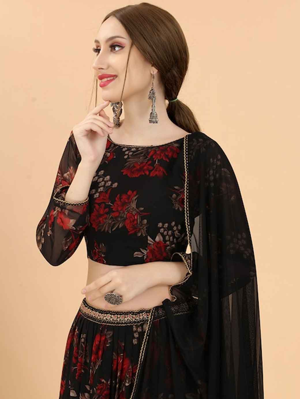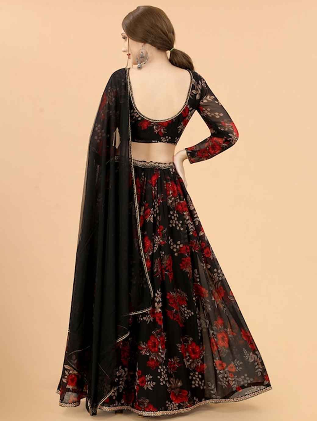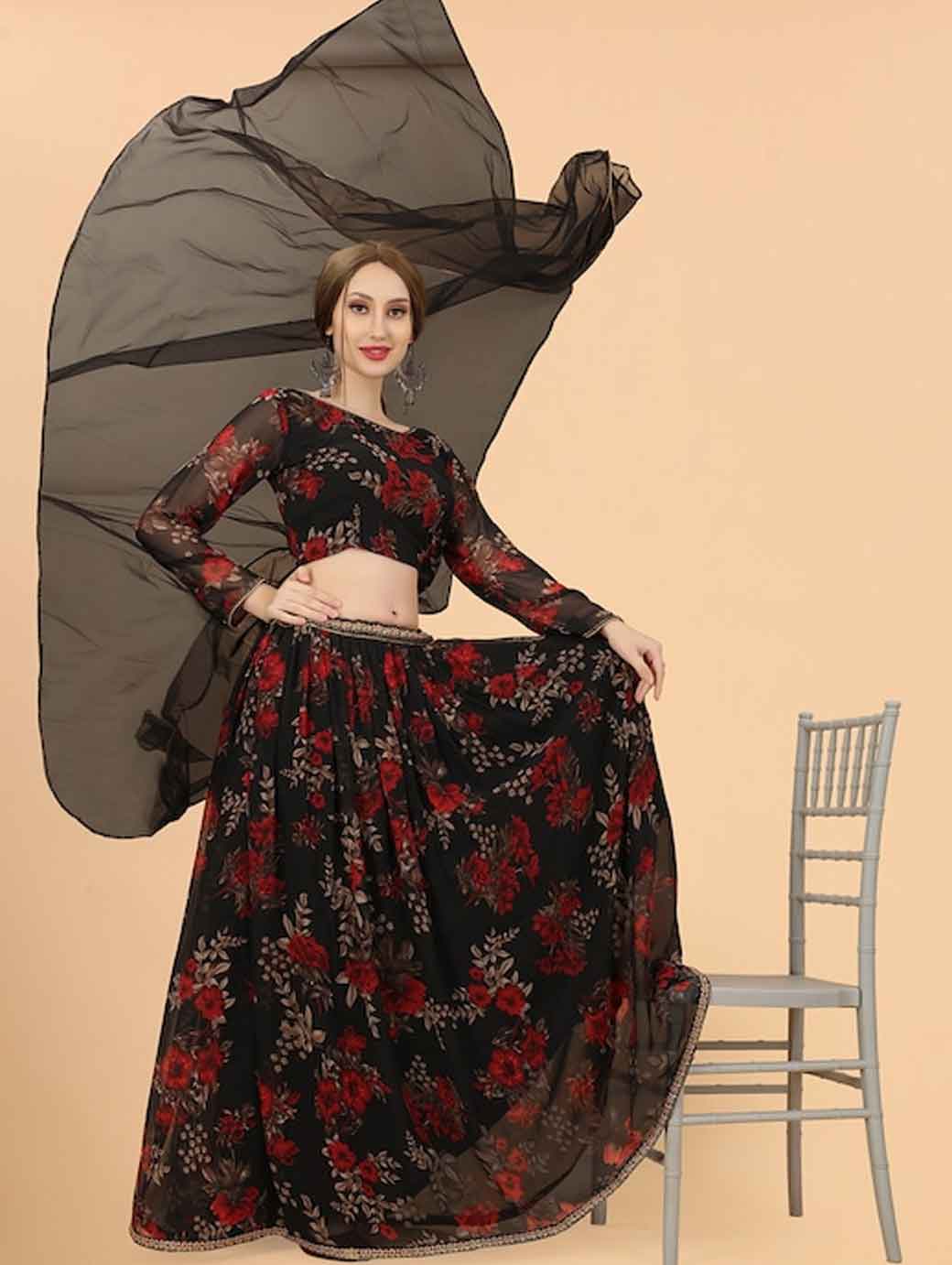 Black & Red Printed Ready to Wear Lehenga & Blouse With Dupatta