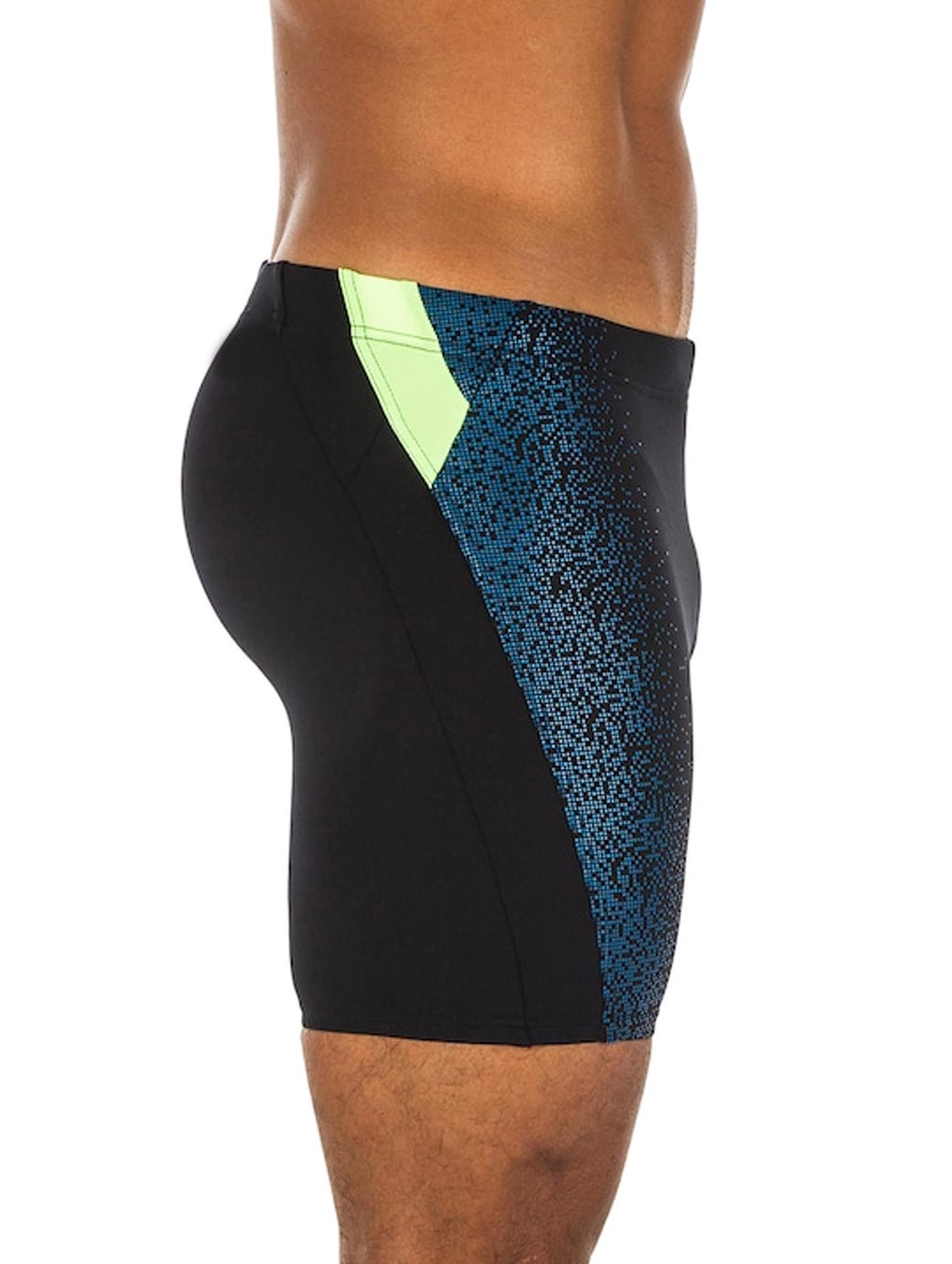 A pair of black and blue printed mid-rise boxer shorts, has an elasticated waistband with a slip-on closure