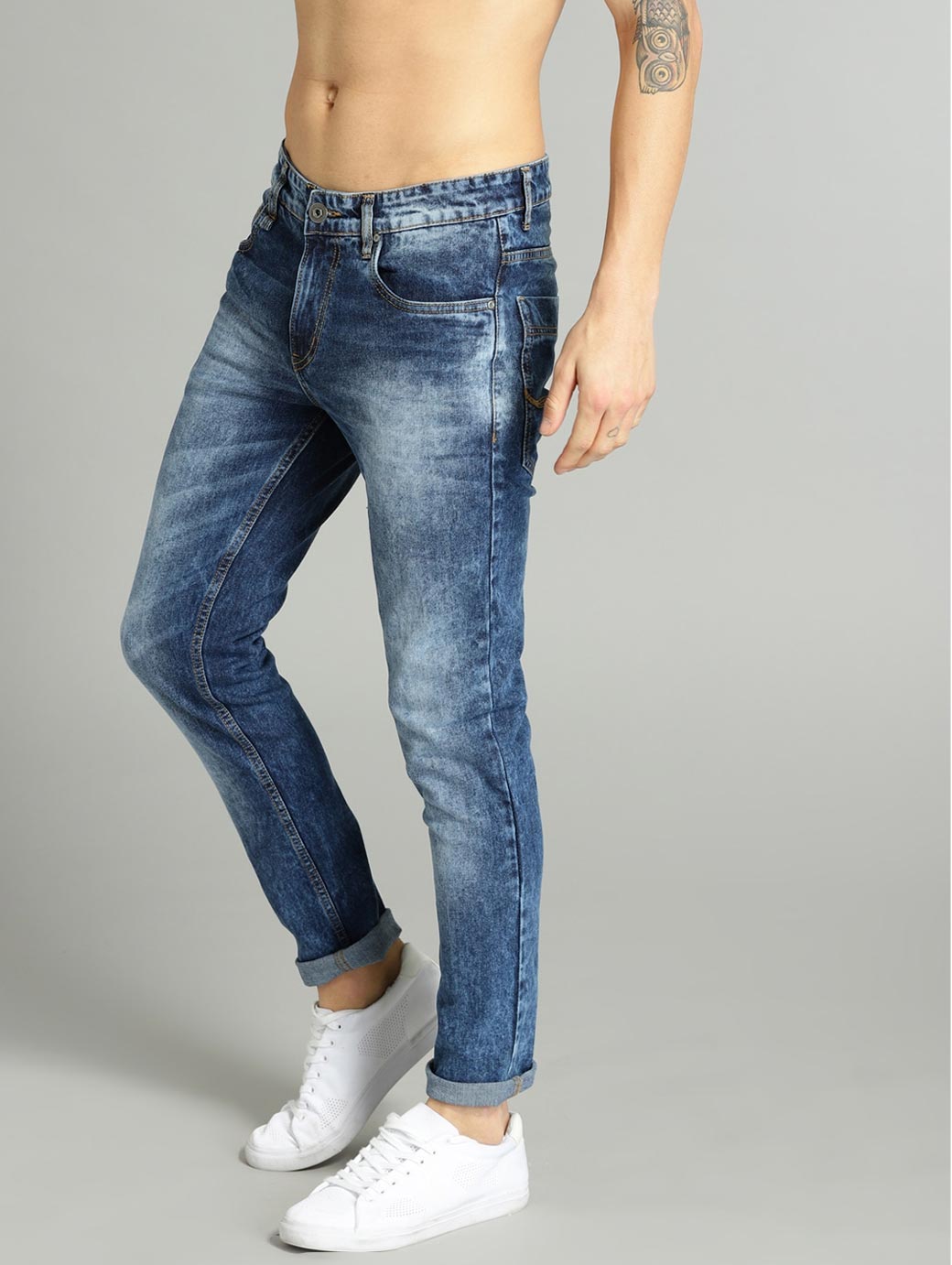 Blue medium wash 5-pocket mid-rise jeans, clean look with light fade, has a button and zip closure, waistband with belt loops