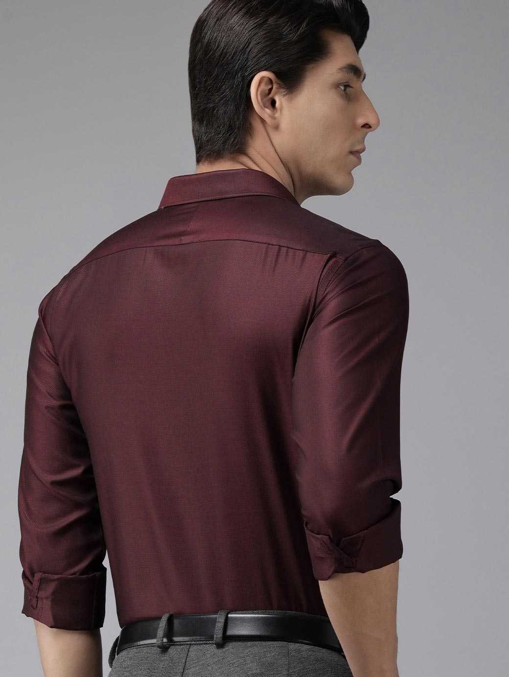 Burgundy self design formal shirt ,has a spread collar, button placket, 1 patch pocket, long roll-up sleeves, curved hem