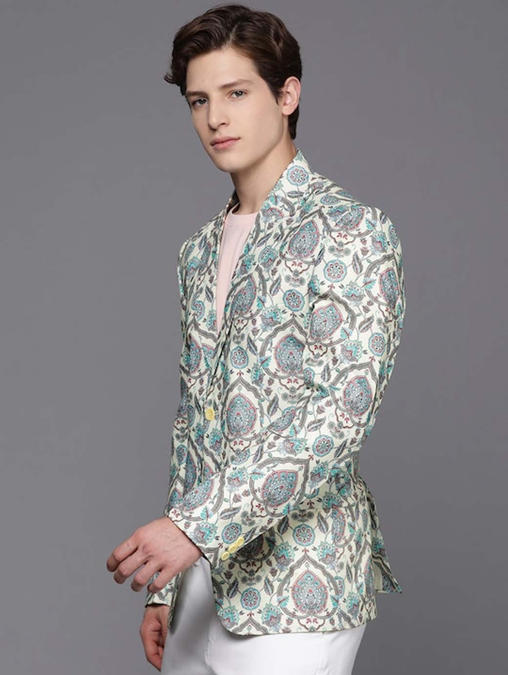 Men Cream Coloured & Green Printed Blazer