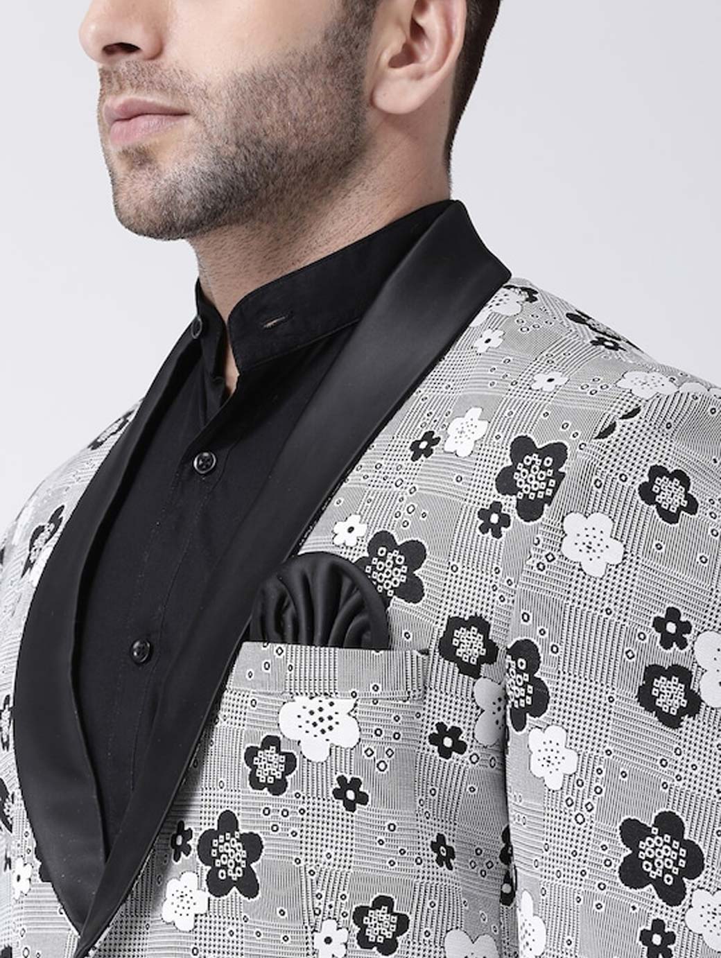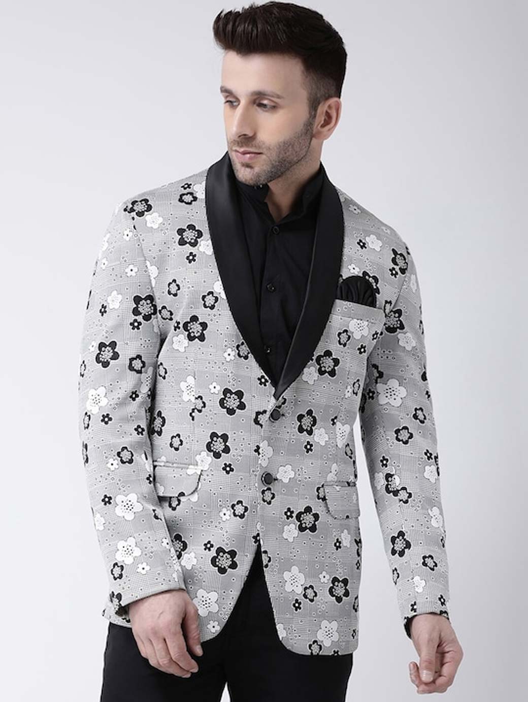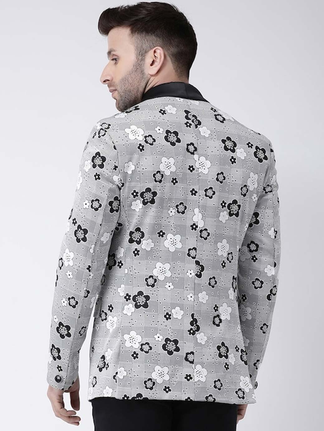 Grey printed regular-fit blazer, has a notched lapel, long sleeves, single-breasted with double button closure, two flap pockets, one welt pocket and a double-vented back hem