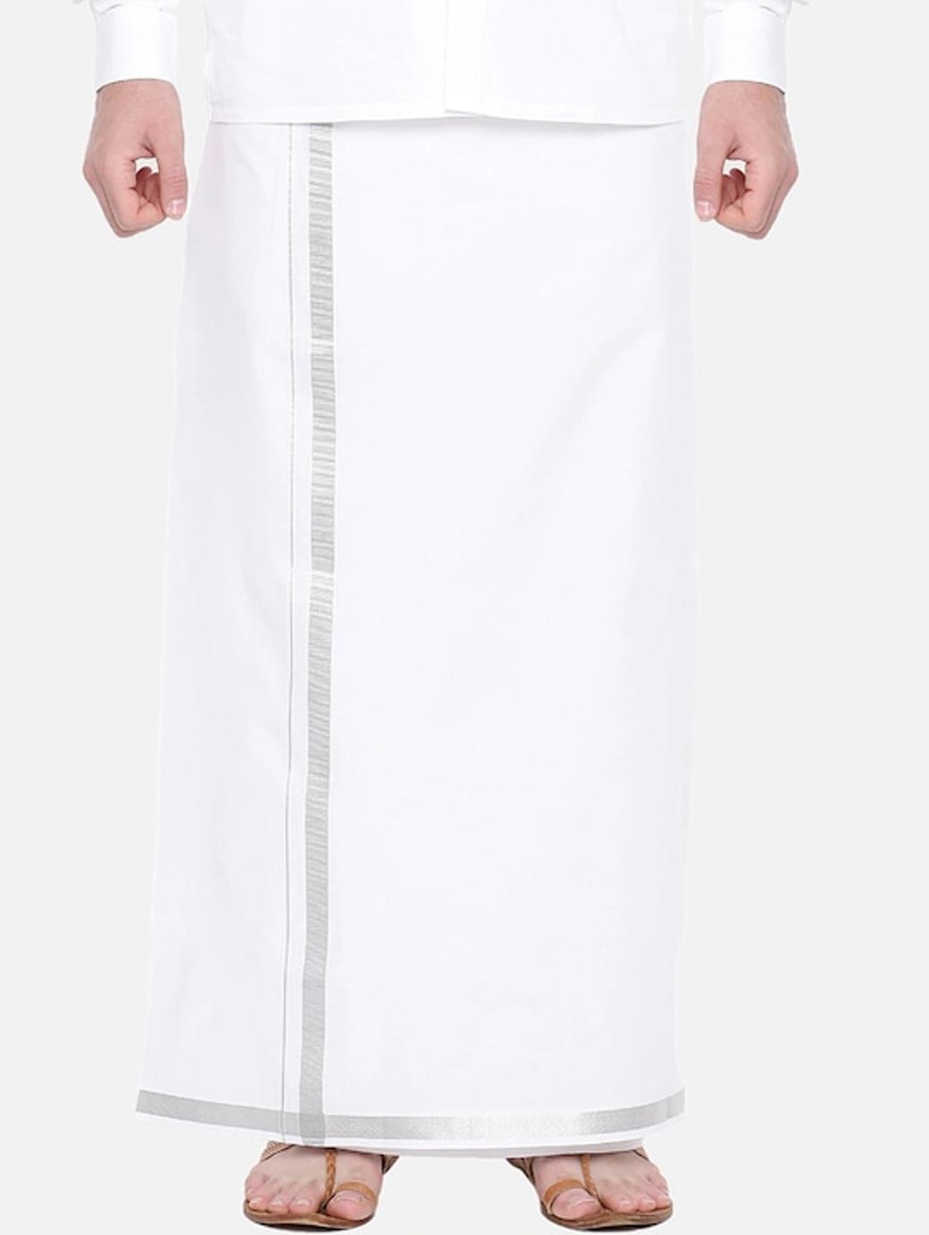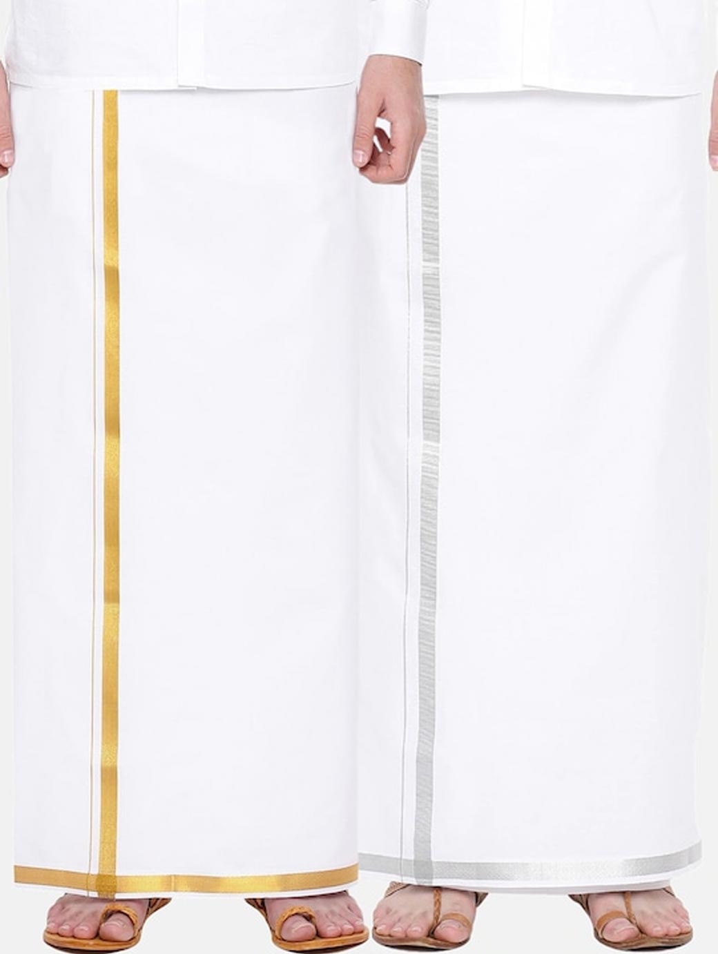 Pack of 2 dhotis White solid dhoti, has a gold-colored zari border White solid dhoti, has a silver-colored zari border