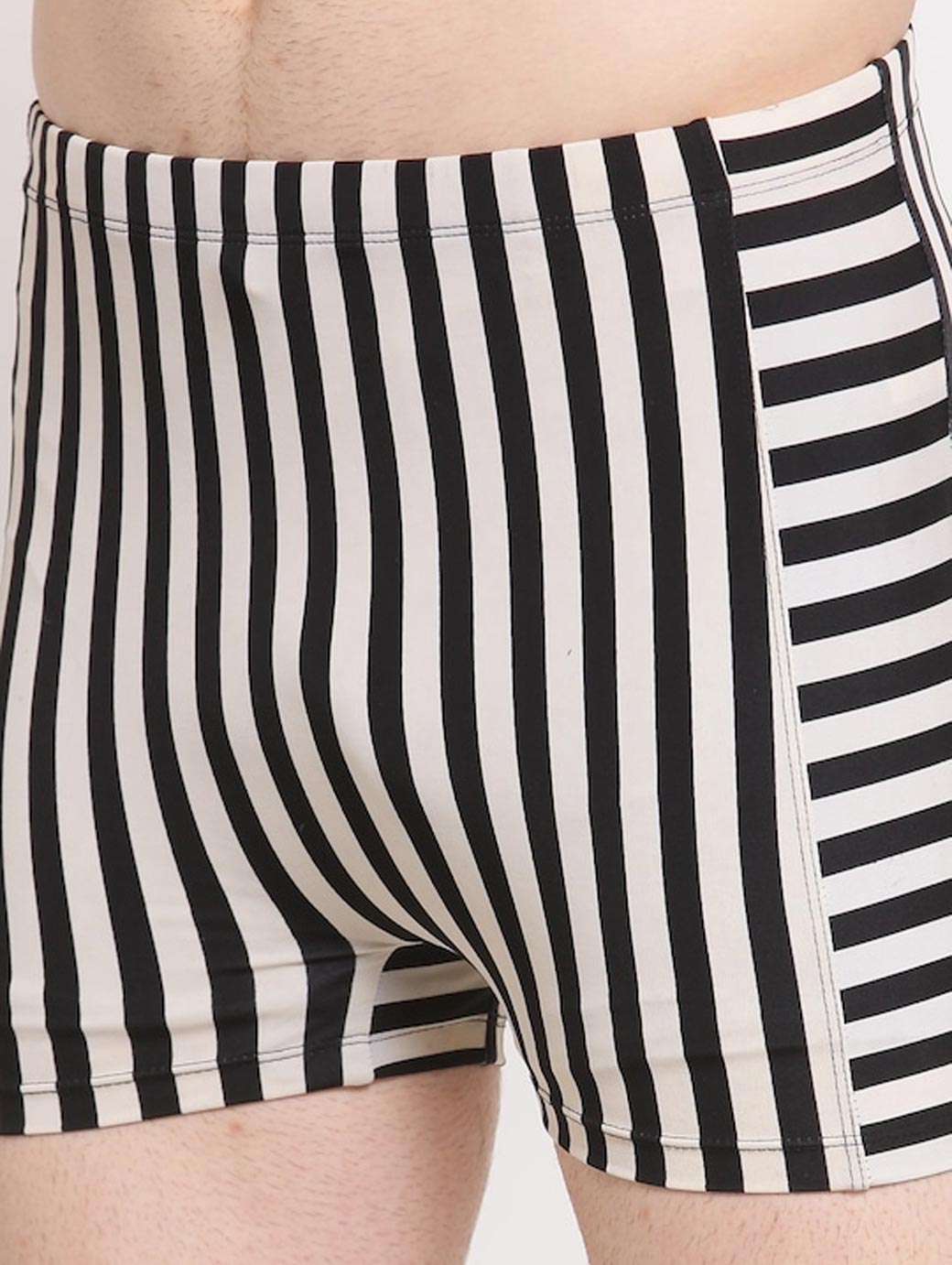 Black and white striped comfort-fit pair of swim bottoms, elasticated waistband with slip-on closure