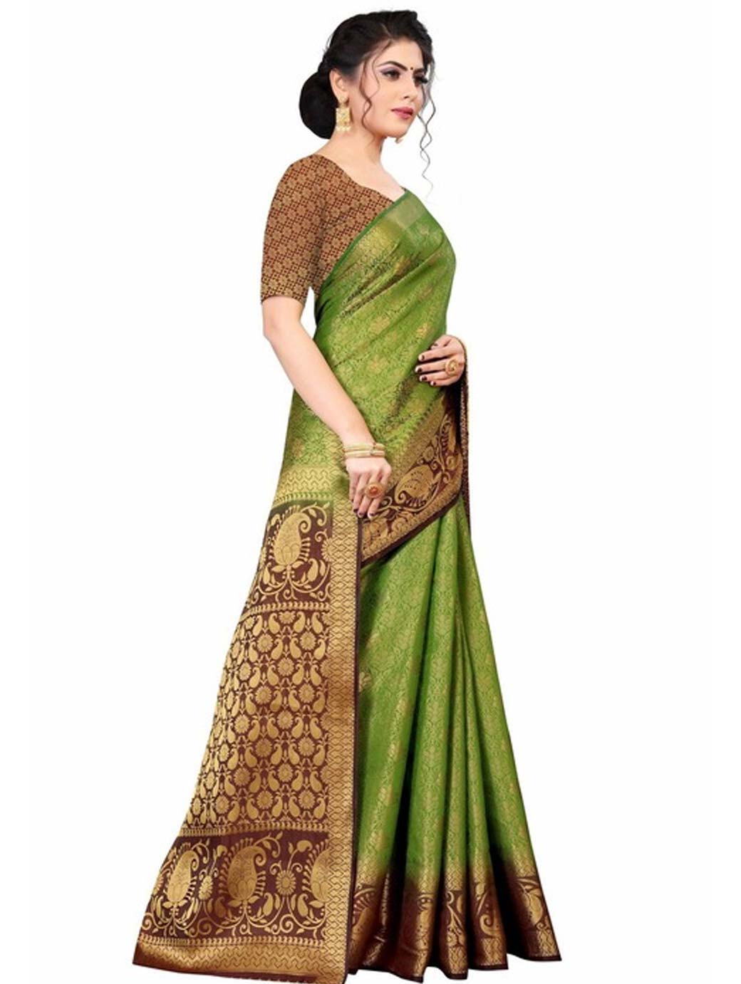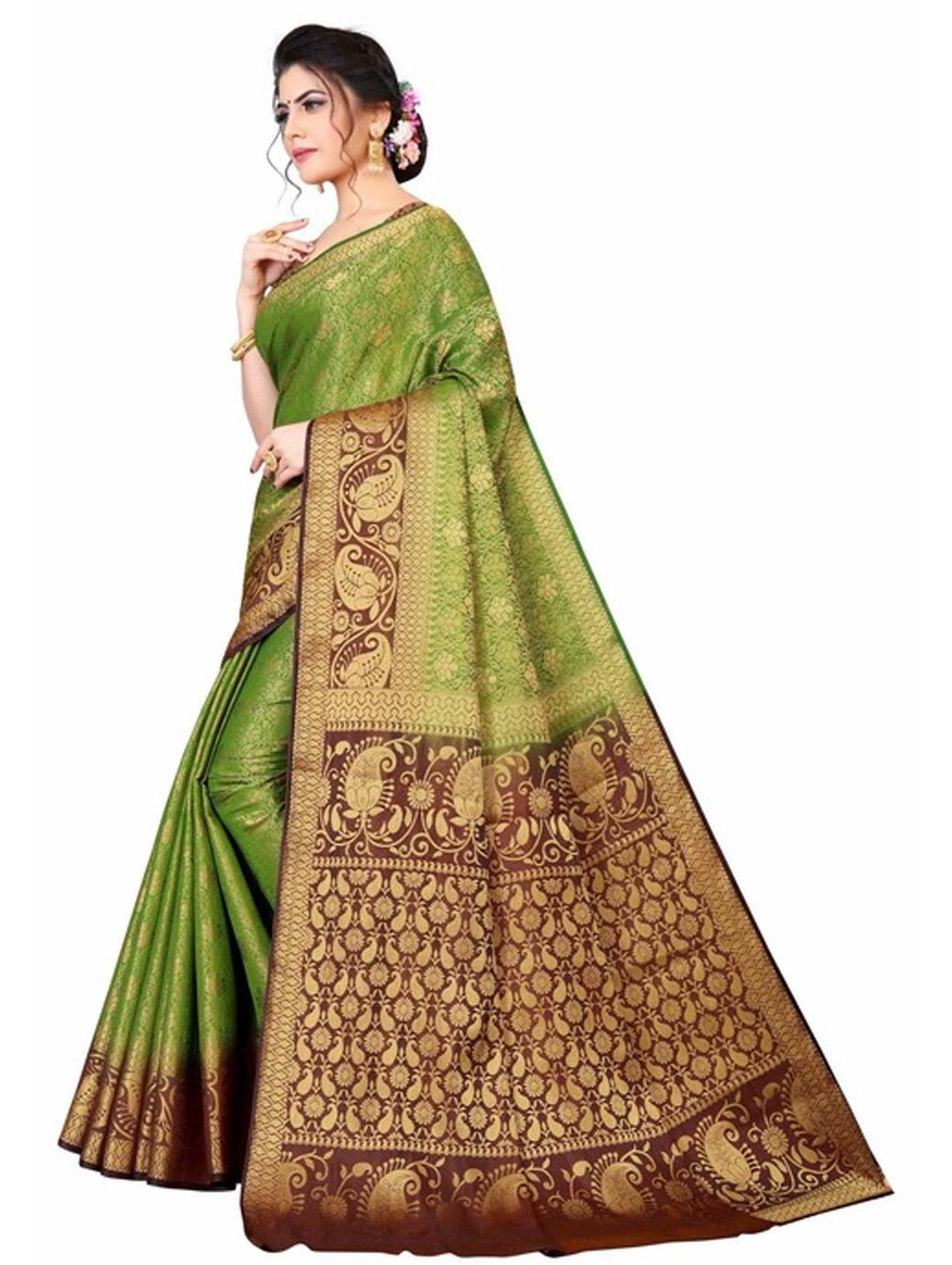 Olive green and brown kanjeevaram saree Woven design saree with woven design border Has zari detail.