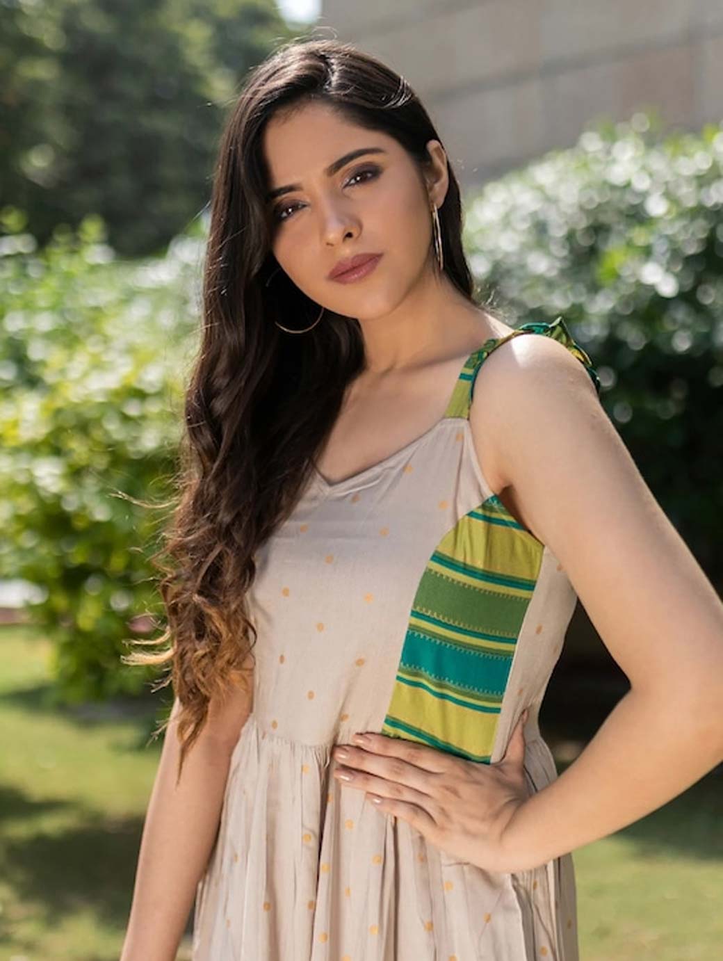Beige colourblocked maxi dress, has a round neck, and flared hem