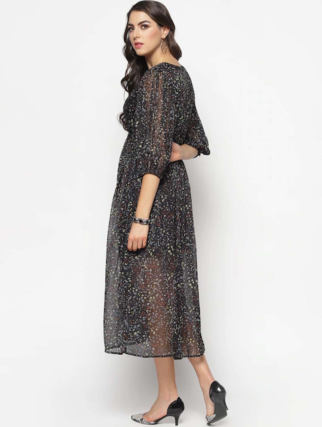 Black and grey printed button longline shrug, has long sleeves, gathers detail, straight hem