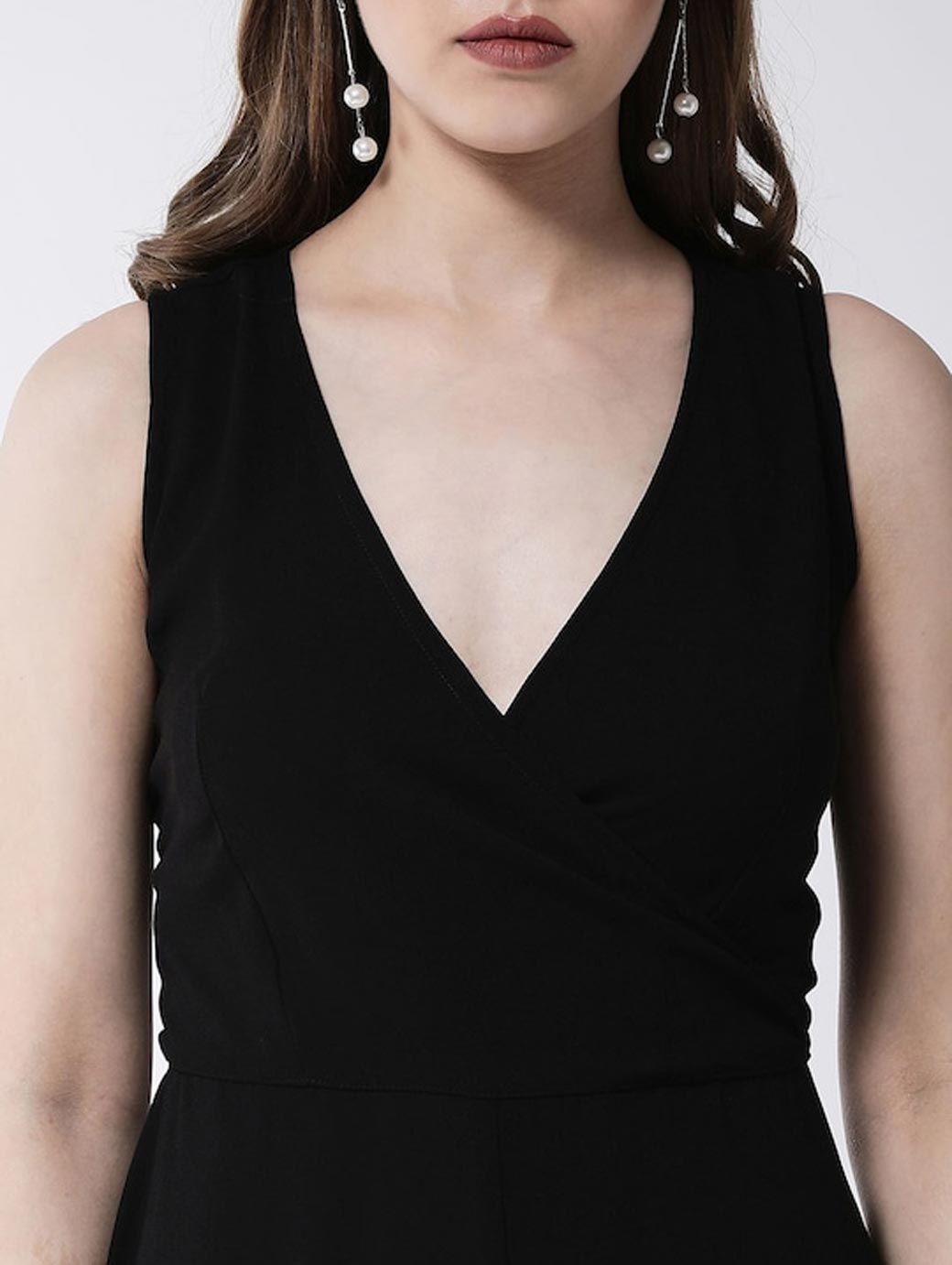Black solid basic jumpsuit, has a V-neck, sleeveless, concealed zip closure