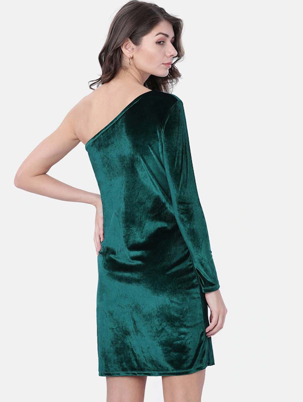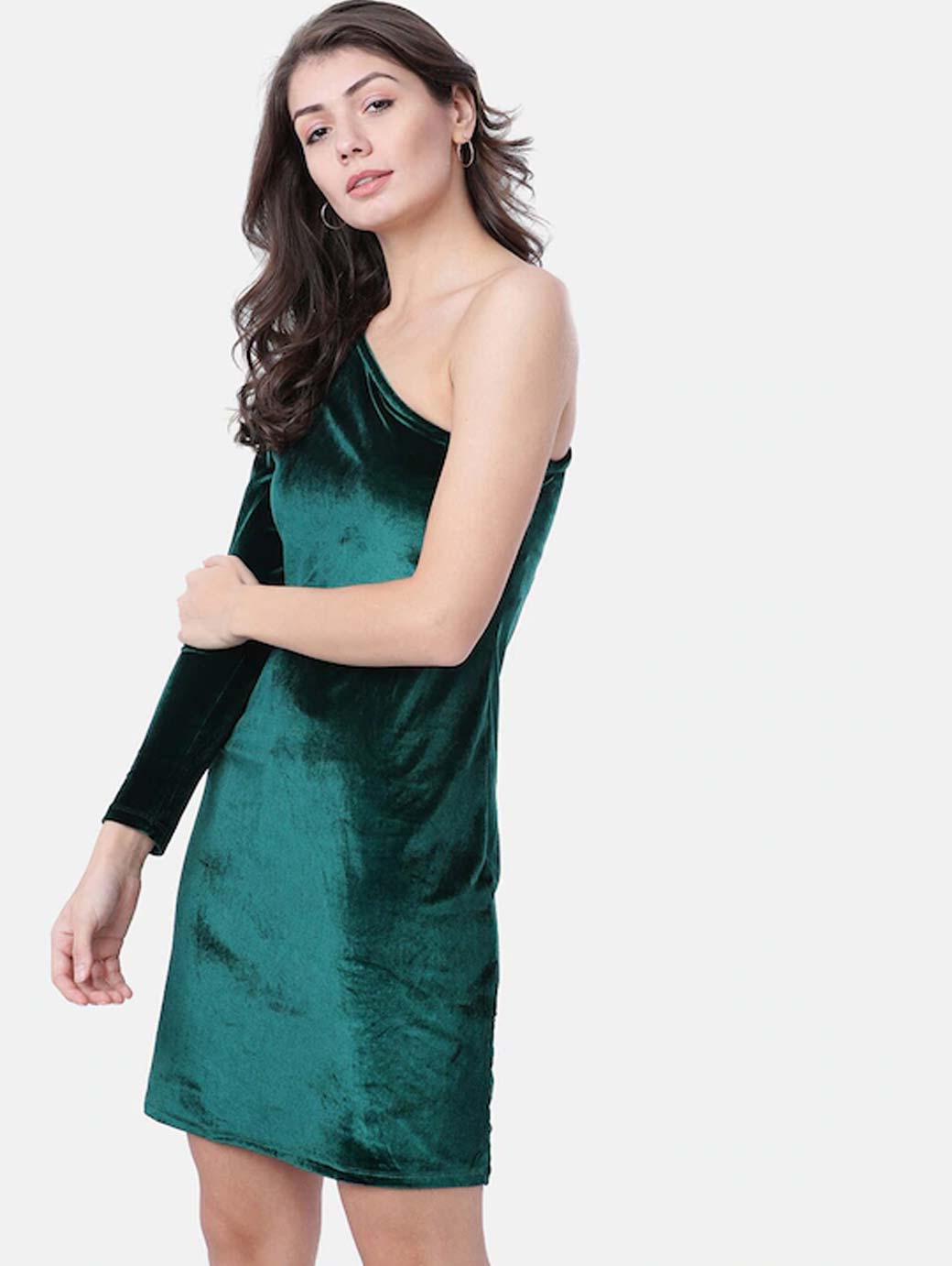 Green solid woven sheath dress, has one shoulder, long sleeves, and straight hem