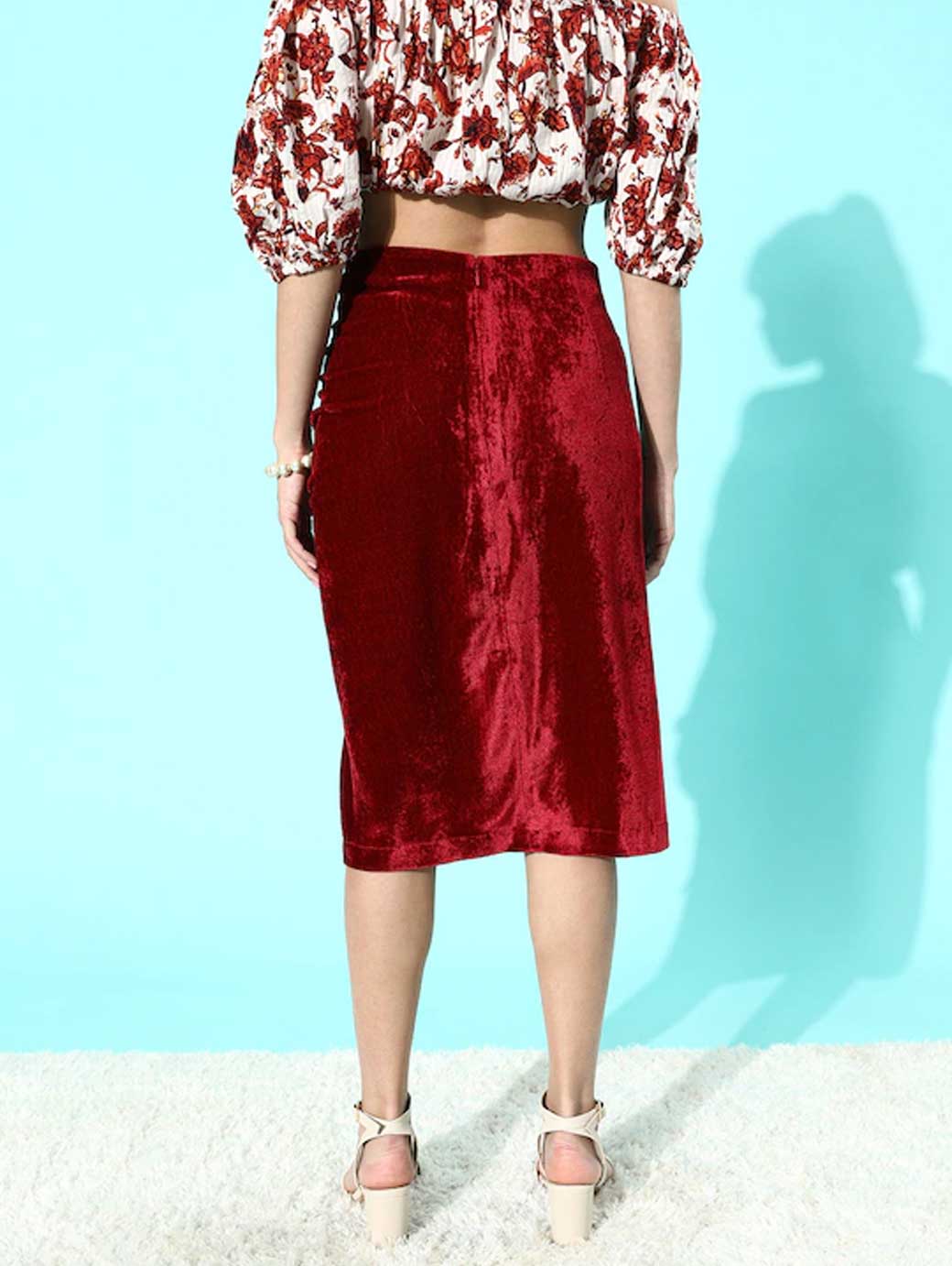 Women Maroon Solid Straight Velvet Skirt
