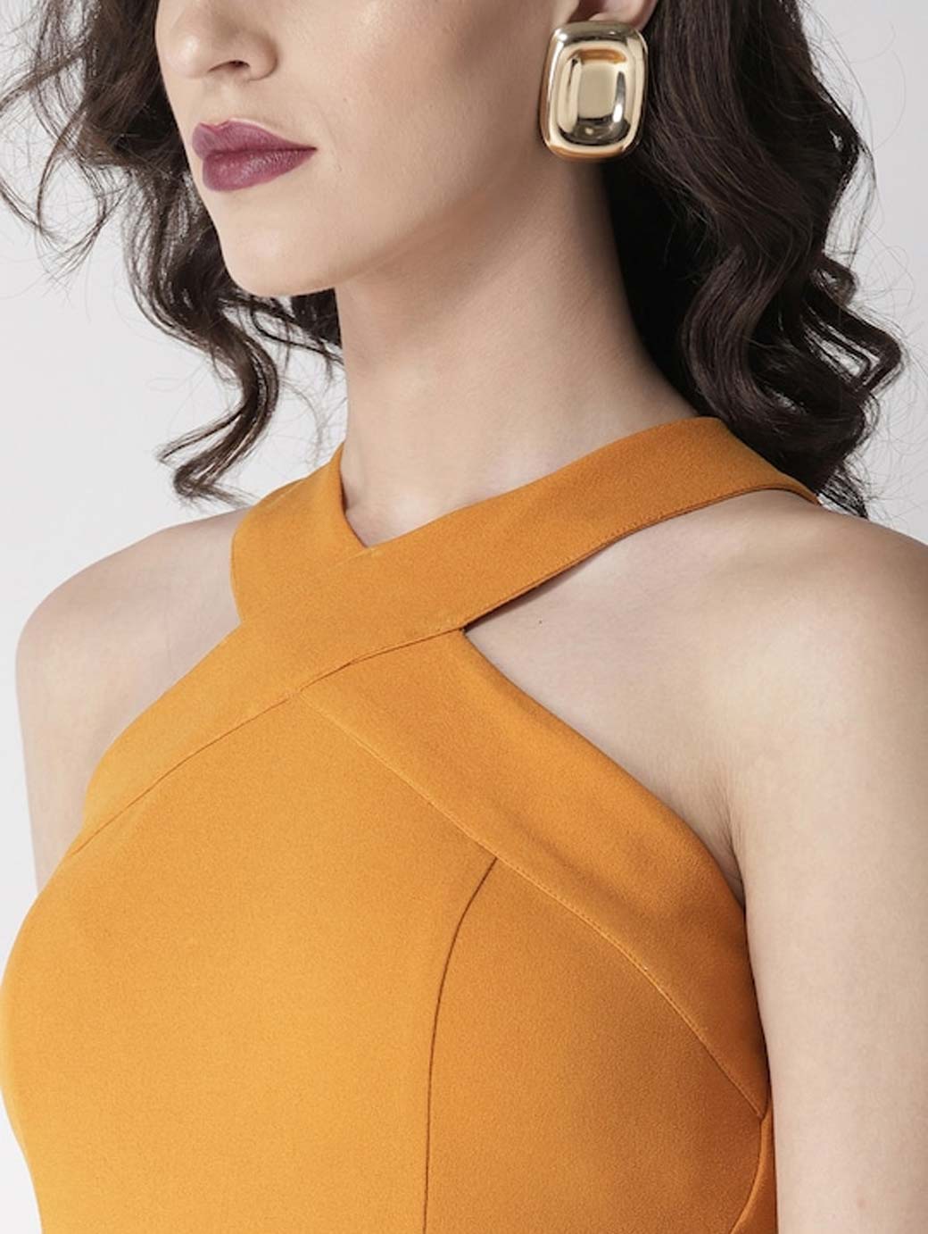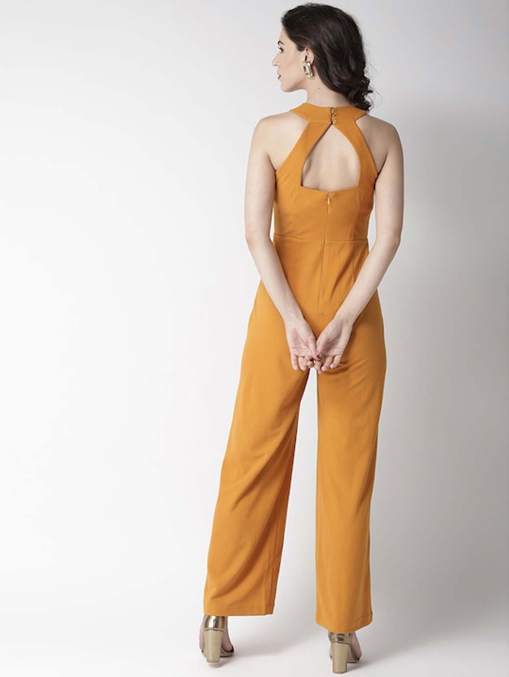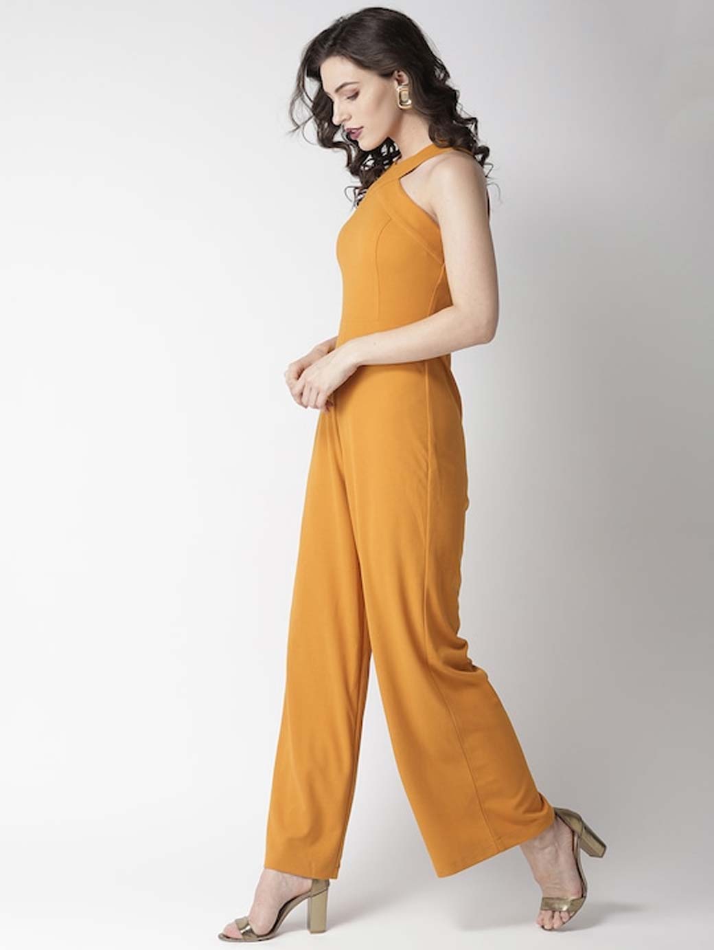 Mustard yellow solid basic jumpsuit, has a shoulder straps, sleeveless, concealed zip closure