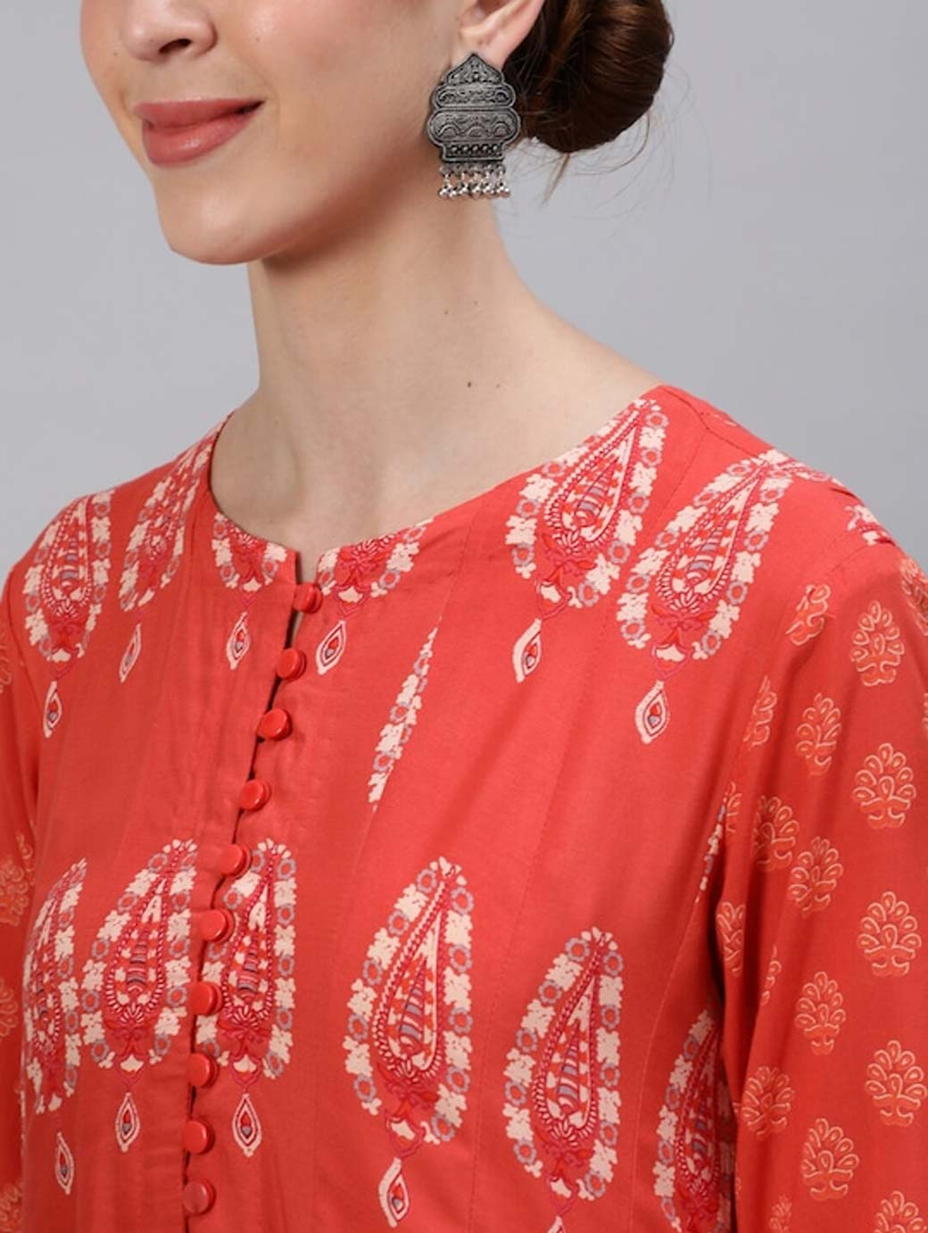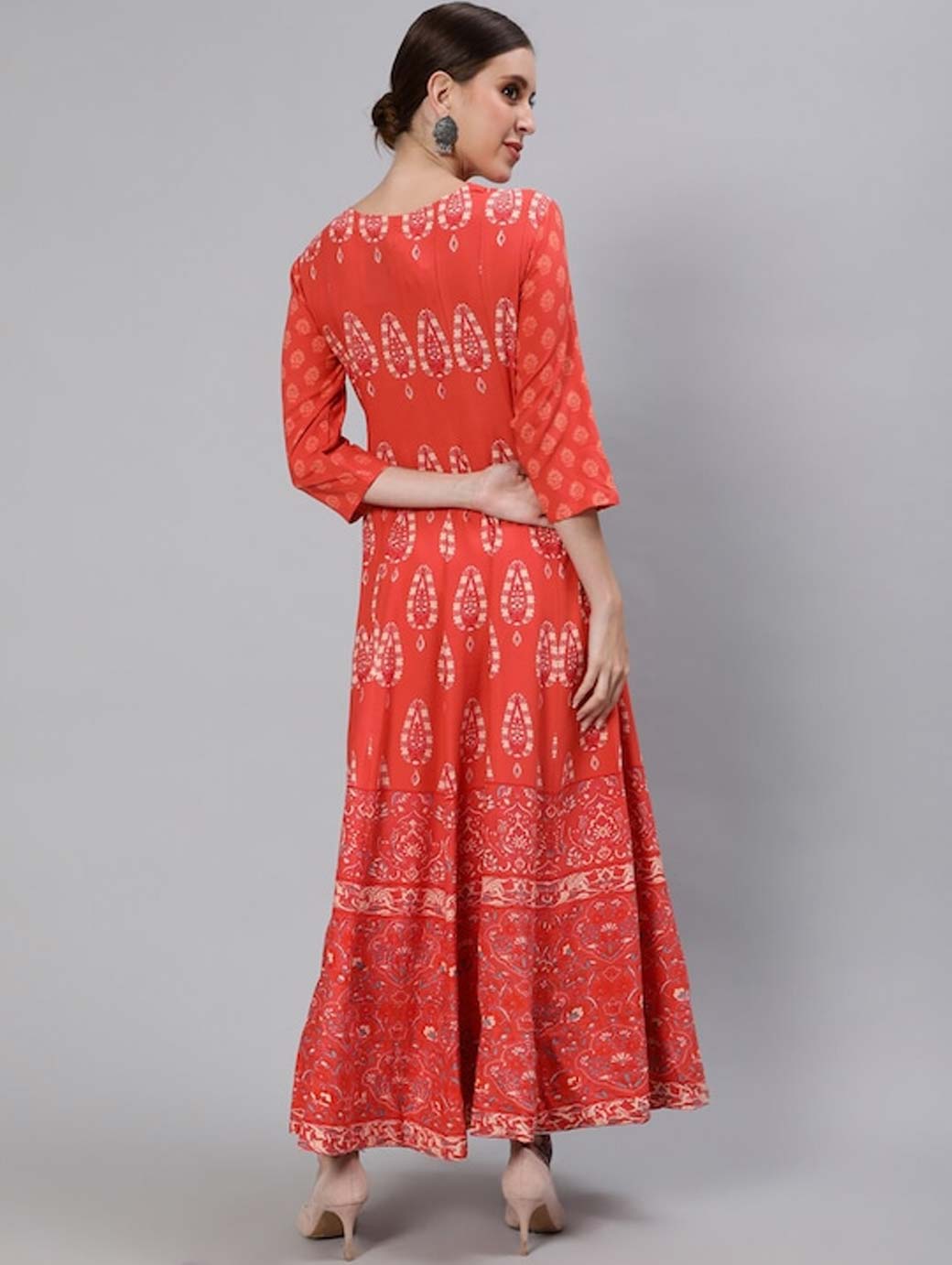 Geometric printed Keyhole neck Three-quarter, regular sleeves Anarkali shape with empire style Ankle length with flared hem Machine weave regular cotton