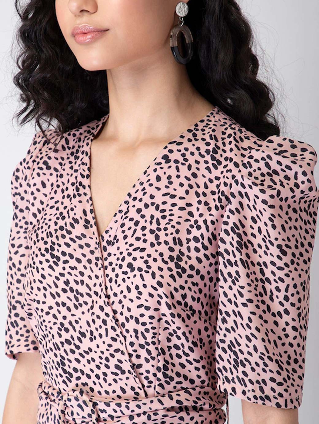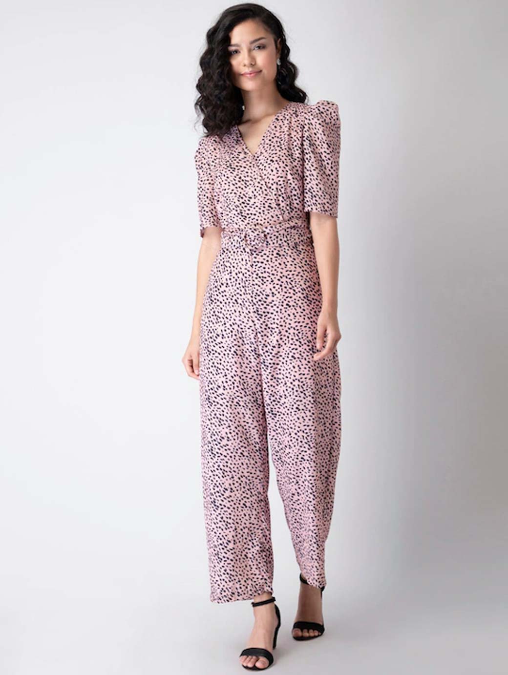 Pink & black printed jumpsuit ,has V neck, three-quarter sleeves, 2 pockets and zip placket with fabric belt