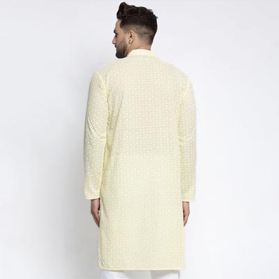 Yellow Floral Embroidered Thread Work Cotton Kurta
